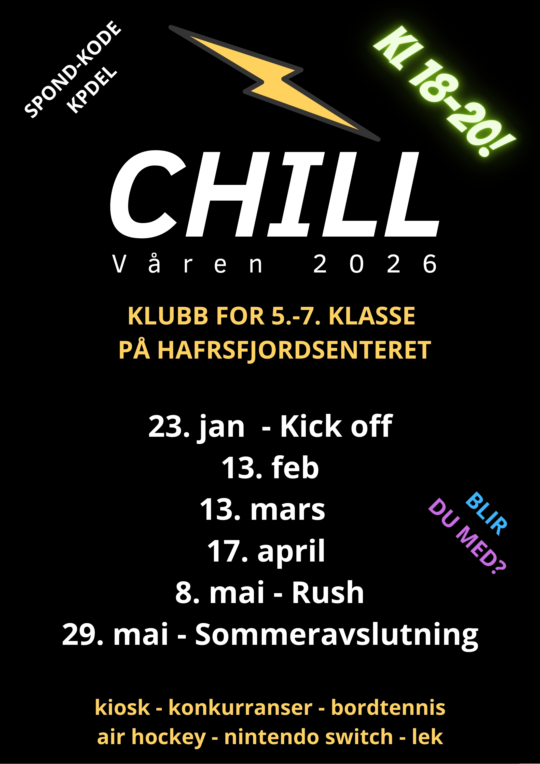 Chill har blitt et populært tweenstilbud som har samlet ca. 100 barn 5-6 fredager i semesteret på Hafrsfjordsenteret kl. 18.00-20.00. Oppstart våren 2026 er fredag 23. januar. Kveldene inneholder kiosk, Nintendo Switch, biljard, air hockey, bordtennis, brettspill, lek, konkurranser, samling, sosialisering, chilling, Kahoot, mat og mye mer.
