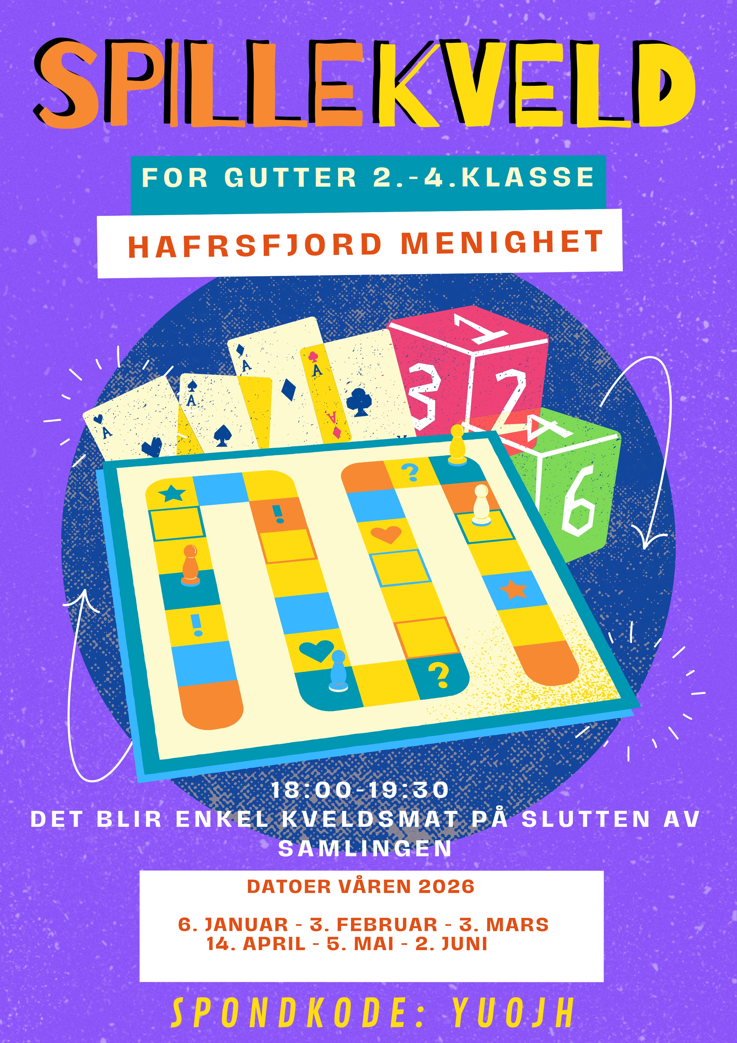 Våren 2026 fortsetter vi med Spillekveld for gutter (2. - 4. klasse). Vi gleder oss til oppstart og håper at mange blir med på dette! Det blir brettspill og et enkelt måltid på slutten av kvelden.